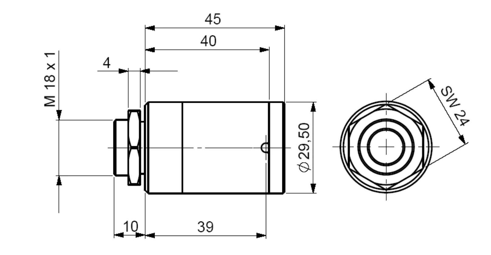 - 크기: Ø29.5 mm x 35 mm, M18x1