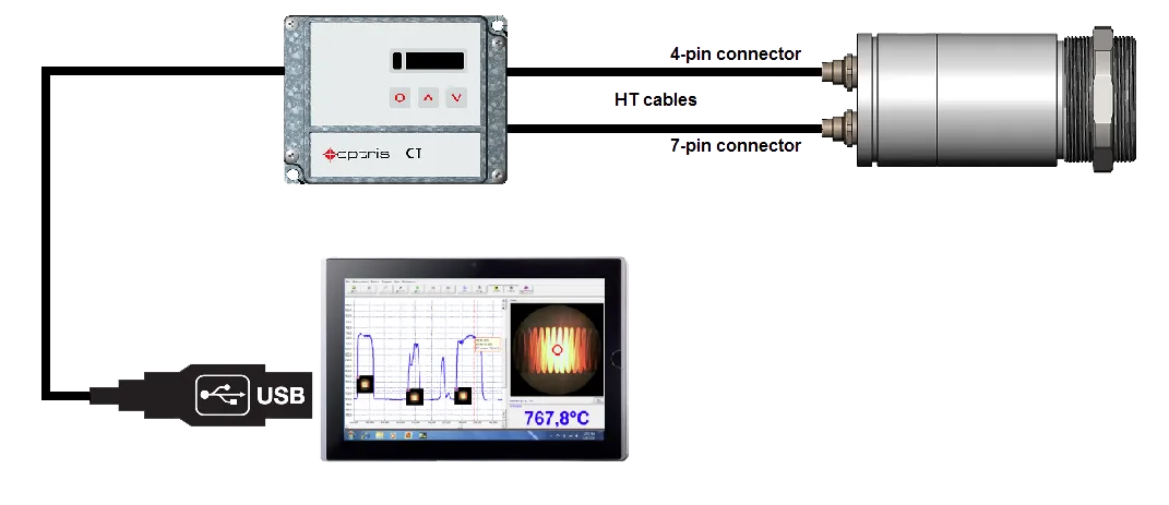 CTvideo 시리즈는 2부 구조로 설계되어 있으며, 전자 박스는 0/4-20 mA, 0-5 V, 0-10 V, 열전대, USB 등 다양한 아날로그 및 디지털 출력과 함께 고급 신호 처리 기능을 제공합니다.