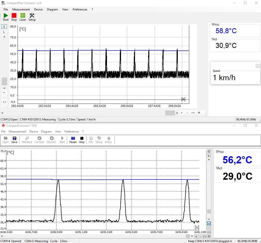 CompactPlus Connect 소프트웨어는 온도-시간 다이어그램과 디지털 디스플레이를 통해 온도 값을 실시간으로 표시하며, 비율값, 최소값, 최대값에 대한 최신 정보를 제공합니다. 사용자는 최적의 시각화를 위해 자동 또는 수동 스케일 조정을 선택할 수 있어, 온도 측정 결과를 정확하고 명확하게 확인할 수 있습니다.