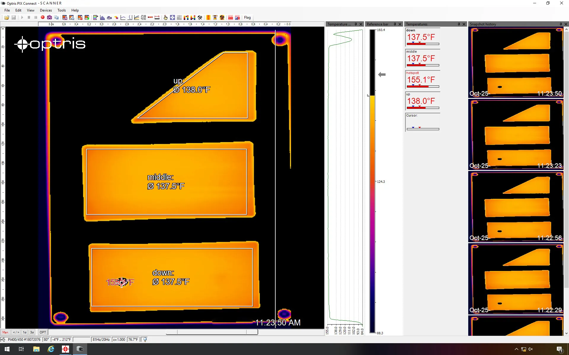PI 450i G7은 PIX Connect 소프트웨어와 함께 사용되며, 라인 스캔 기능을 비롯해 핫·콜드 스폿 분석, 히스토그램, 시간–온도 곡선, 온도 프로파일, 이미지 병합 등 다양한 열화상 분석 기능을 제공합니다.