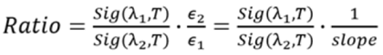 The emissivity ratio is summarized and referred to as the slope, with slope = e1/e2. While the values for emissivity in practice range between 0.07 and 0.95, the values for the slope are typically between 0.7 and 1.3.